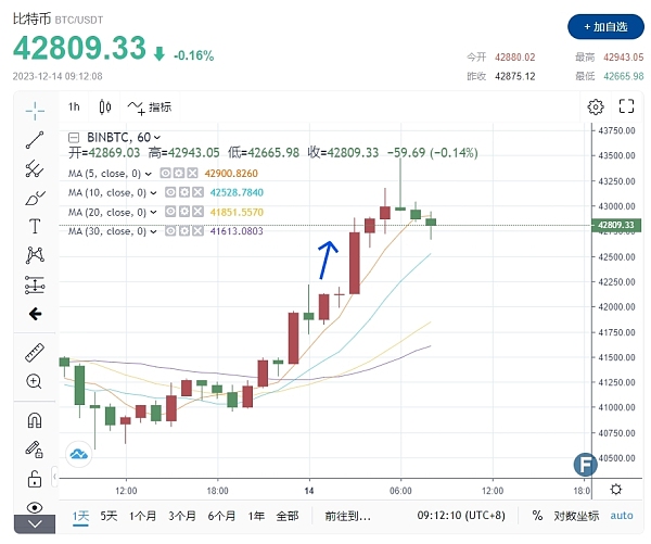 周四(12月14日)亚市,比特币最高攻上42943美元,美联储主席鲍威尔鸽派信号刺激多头,他相信政策利率已达到或接近峰值,并称不会等到2%通胀率再降息,认为那将会太晚。美国最大合规加密交易所Coinbase宣布,在美国境外提供现货加密货币交易以拓展全球市场。尽管现货ETF未有新进展,但美国商品期货交易委员会(CFTC)主席声称大多数加密货币都是商品,承认正与美国证监会(SEC)争夺加密领域监管权。