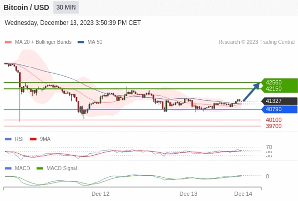 CMTrade表示,比特币RSI高于50,MACD位于信号线上方,呈正值。此外,价格高于20和50周期移动平均线,分别为41145和41151美元。