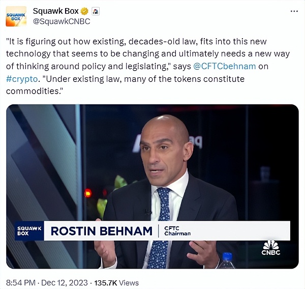 据IBtimes报道,美国CFTC主席Rostin Behnam表示,根据现行法律,大多数加密资产都是商品,同时其承认监管机构之间正在就谁有权监管加密行业展开“地盘争夺战”。