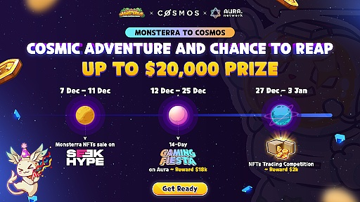 为了纪念这次整合,Monsterra 邀请玩家和加密货币爱好者参加为期 30 天的“Monsterra to Cosmos”活动,时间为 2023 年 12 月 7 日至 2024 年 1 月 6 日。此次包括三项主要活动:NFT 销售、为期 14 天的宇宙派对和 NFT 市场交易竞赛。参与者有机会争夺高达 20, 000 美元的 $AURA 和 $MSTR 代币奖励。