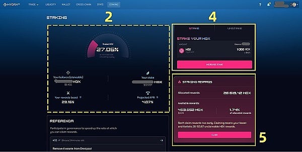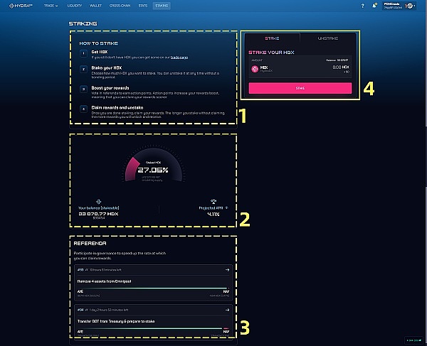2- 区多了两项:You stake(您的质押量)和 Your rewards boost(您的奖励提升比例)。奖励提升比例,与公投的参与数、投票数量和信心系数,都有关系。关于质押的详细原理,可参考官方的帮助文档:https://docs.hydradx.io/staking