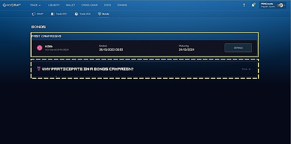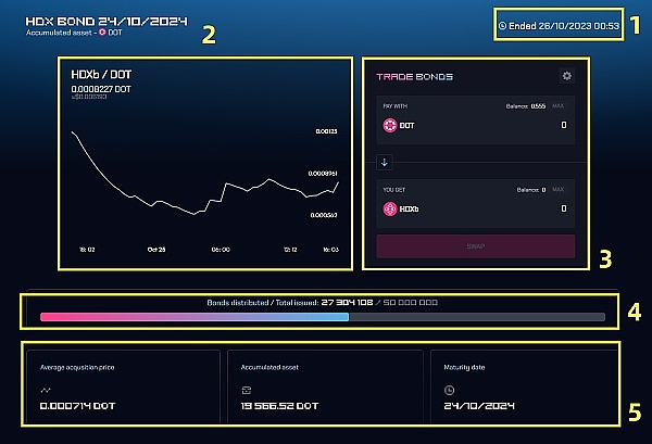 实线框的地方,记录着以往举行过的债券活动。上一次波卡 DOT 大解锁时,HydraDX 进行了一次 xHDX 债券的 LBP 活动。现在,让我们来看看这次活动的成果。点击 DETAILS(详情)按钮,进入如下界面:
