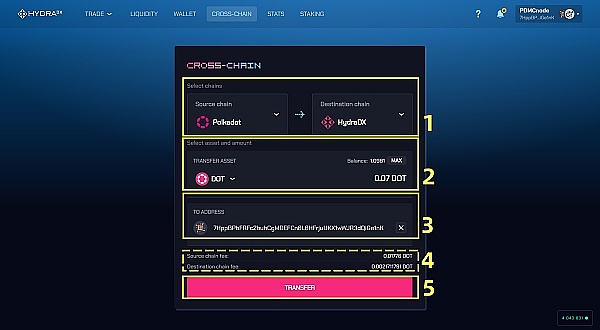 在波卡,跨链是一个重要的操作。原来,每种币只是在自己所在的链上可以自由转账,跨链平台出现后,一种币就可以从自己所在的链转账到另一条链,“跨链”也就成了一种既常规又重要的动作。HydraDX 的跨链操作界面如下: