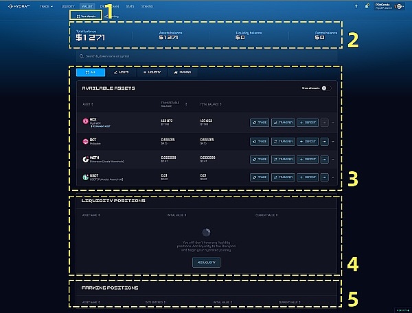 1- 点击 Your Assets(您的资产)进入上面的界面。(1 右侧有个 Vesting 选项卡,这是归属资产领取执行区,如果参与了 HydraDX 或 Basilisk 的众贷,就可以在这里领取赠送并归属的 HDX,因为操作简单,这里不再赘述。)