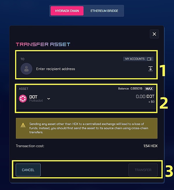 目前显示的是 HYDRADX CHAIN(Hydradx 链)的转账界面。这是一个同链转账界面,您可在 1 处输入收币的地址,在 2 处选择要转的资产和数量。确认无误后,点击 3 处右侧的 TRANSFER(转账)按钮(输入数字后会高亮显示),即可完成转账。当然后续仍然会重复《波哥说九头蛇(2)》中图 5-6 的步骤。如果填好数字后又不想转了,可点击 3 处左侧的 CANCEL(取消)取消转账。