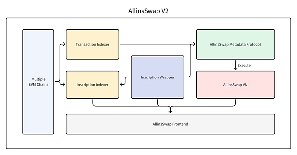 在 Allins v1 中,系统包含了一个 AMM 铭文设施,其通过引入新的虚拟机系统,以及一套包含铭文资产索引器、交易操作索引器等在内的系列设施,通过全新的Allins虚拟机来自动路由多链铭文资产,并在将资产封装到虚拟机中后为其建立跨链交易,提供流动性,该功能将在 Allins v2 推出。