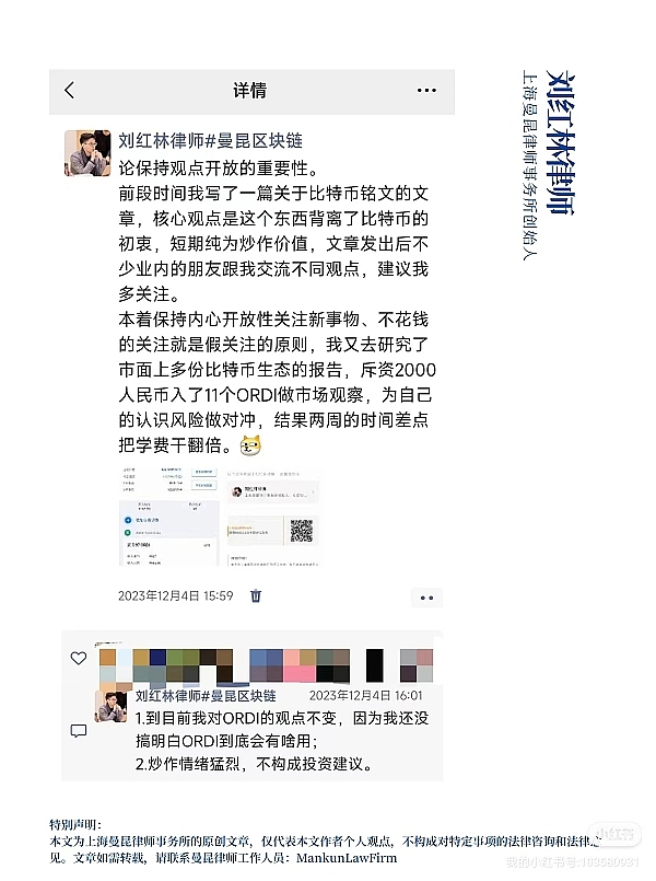 关于铭文有无价值的讨论已经是明日黄花,我所主任刘红林律师曾认真地写了一篇文章,深刻指出铭文的出现完全背离了中本聪创造比特币的初衷《比特币铭文:一场背离中本聪初衷的炒作》。在前一段时间我们曼昆律师团队内部讨论中还断言这是一场郁金香般的金融泡沫,我深以为然,然后按兵不动。果不其然,涨了。恰好这时候主任悄悄在朋友圈晒出Ordi持仓,毫无意外地显示涨了84%,同时勉励大家拥抱新事物。