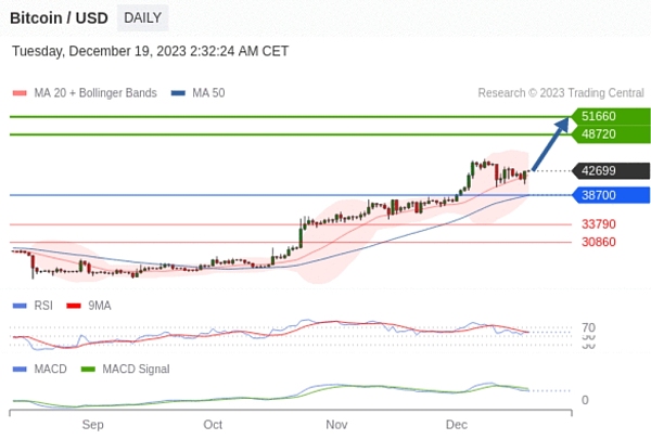 CMTrade表示,比特币RSI高于50,MACD为正且低于信号线,价格可能会出现短暂回调。此外,价格交易高于20和50周期移动平均线,分别为42007和38699美元。