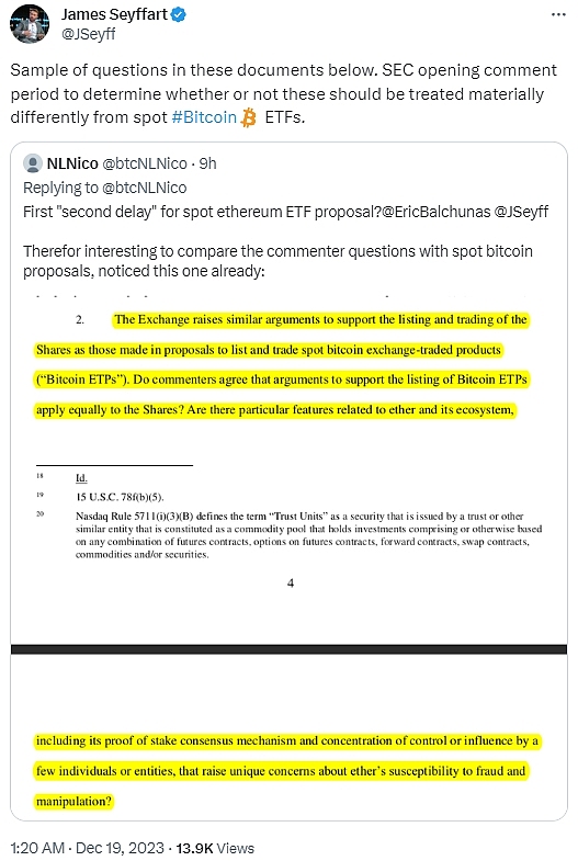 彭博分析师James Seyffart在推特指出,美国证监会已开放评议期,以决定以太币现货ETF是否应与比特币现货ETF区别对待。此前,监管机构已推迟对Hashdex、灰度(Grayscale)、方舟基金(ARK)的21Shares和VanEck等多个比特币现货ETF申请做出决议。