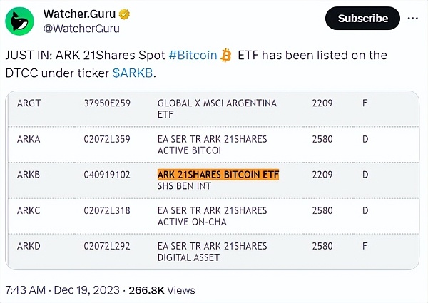 Watcher.Guru发推称,方舟基金与21Shares的现货比特币ETF已被添加至DTCC网站,交易代码为ARKB。