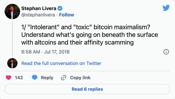 但是,当比特币爱好者闯入其他人的生活,并从道德优越感的角度攻击他人时,就已经逾越了界限,有毒的比特币至上主义者表现为“比特币还没有大获全胜,其他人都必须失败”。