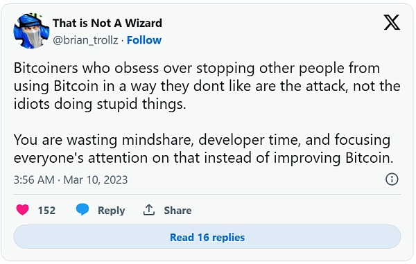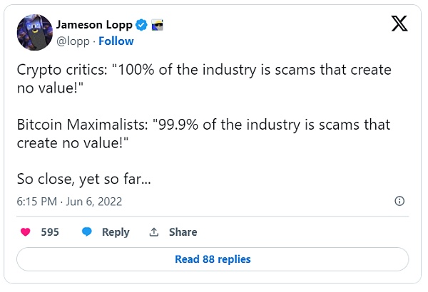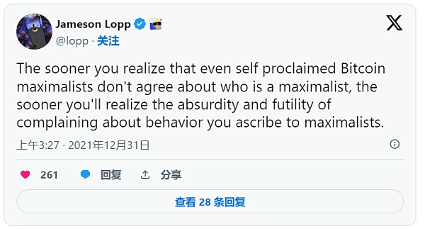 我认识的绝大多数至上主义者都对他们的观点充满信心,他们坚定的认为比特币将占上风,根本没有必要批评竞争项目。只有少数喜欢在社交媒体上争吵不休的人成为笑柄,同时塑造了一种不适用于大多数人的刻板印象。我们无法阻止这些人,但可以拒绝成为他们。