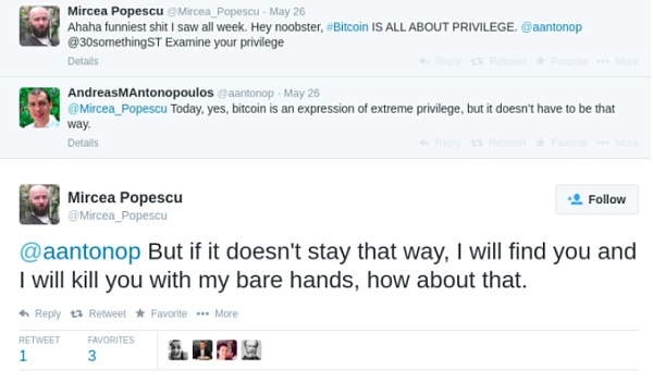 Popescu 是该 IRC 房间的管理员,如果你不适应他们的文化,不了解他们的行话,并且对偏见、厌女和种族主义没有很高的容忍度,那你可能会觉得很难受。Mircea 不太重视他的沟通效果,他会以夸大其词、难以理解的方式发表言论,并不关心别人如何解读。以其反对隔离见证的文章为例,在这篇文章中,他决定通过悬赏暗杀一名协议开发者来「解释」他的观点。虽然他这样做是为了提出一个关于可验证性的有趣观点,但由于其令人震惊的价值观和缺乏详细的解释,绝大多数读者都没有注意这个观点。