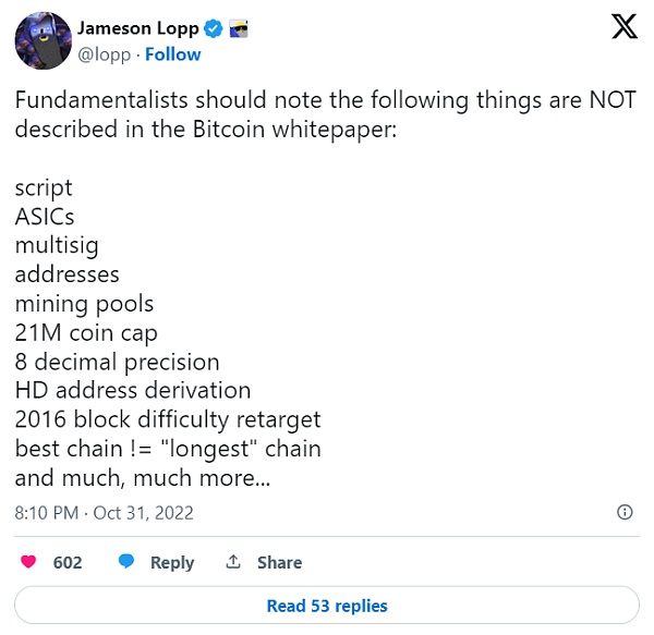 正如 Rigel Walshe 提到的模仿理论概念,简而言之,将比特币的许多关键原则提炼成为简洁有力的模因,这对比特币来说是件好事,因为它使得其基本原理的传播更快、更容易。讽刺的是,这篇文章的长度将限制其传播,我并没有忽视这一点。但不幸的结果是,虽然模因使主流化变得更容易,但也必然意味着人们对其基本原理的理解变得肤浅,并最终迷失。