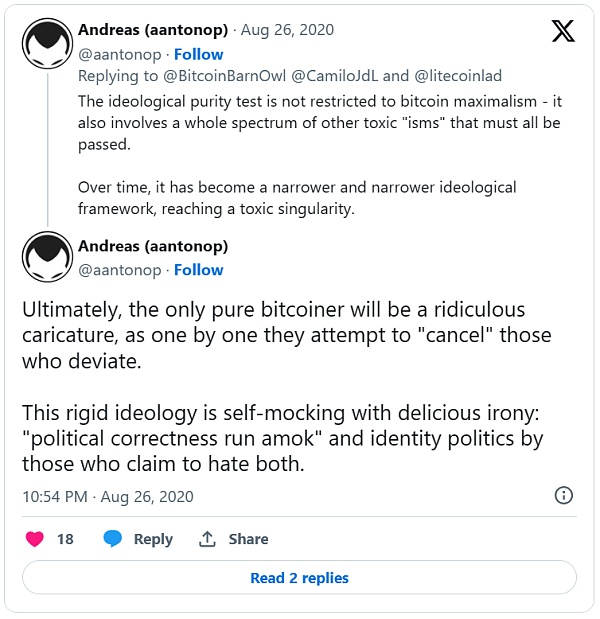 “如果你认为我会通过限制我的求知欲、拒绝阅读或学习来‘忠实’于至高无上的比特币,那不是科学,那是宗教,而且我不信教。这是一个试金石,一个忠诚度测试,一个纯洁度测试,但我什么都不会做,我将保持求知欲。 ”—— Andreas Antonopoulos