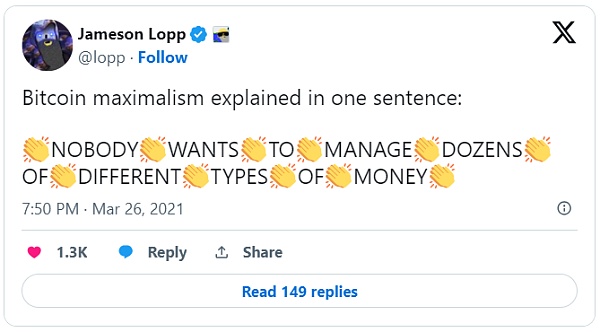 许多至上主义者认为,投资其他加密货币是愚蠢、不道德或无趣的,应该予以劝阻,造福他人,并作为消费者保护的一种形式。