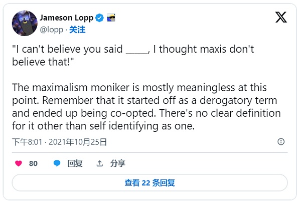 文化对贬义词重新定义的历史由来已久。我认为这在比特币至上主义上也有意义,因为我们正在谈论意识形态差异:让许多人反感的比特币至上主义,对于认可的人而言却是非常可取的。我还认为,虽然至上主义是驾驭加密生态系统的一种方式,但它也是一种理想。请记住,Vitalik 对这个词的使用是为了「主导权最大化」,也就是加密生态系统将由比特币主导。尽管比特币在 14 年后仍毫无疑问地占据主导地位,但它并不像许多至上主义者所希望的那样。