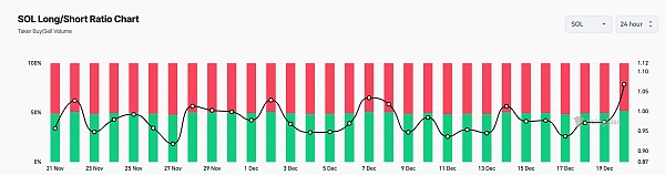 12月20日,SOL多头/空头比率升至1.07,为过去30天内的最高水平,这证实了交易者越来越多地押注Solana价格上涨将在未来几天升至新高。