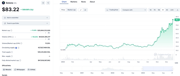 周四(12月21日)亚市,Solana代币SOL升至83.22美元,单日录得逾10%涨幅,今年涨幅达到惊人的589%。本周创下今年新高价后,Solana市值成功超越瑞波币(XRP),登上全球第5大币种。在衍生品市场,多头/空头比率已触及1.07的30天高点,表明大多数交易者押注价格进一步上涨。
