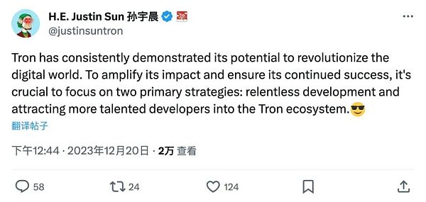 12月20日,波场TRON创始人孙宇晨在社交媒体表示:“波场TRON一直在展示其革新数字世界的潜力。”