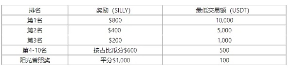 进行 SILLY/USDT 交易,交易额不低于$100 的用户,将根据累计交易额进行排名,共同瓜分 $3000 SILLY/USDT,具体奖励见下: