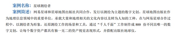 值得一提的是,网易区块链提供区块链技术支持,与星球地图出版社共同合作发行的数字藏品——星球测绘者,作为典型案例入选了《白皮书》的「数字文创应用案例」。