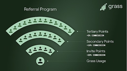 二是推荐新用户获得佣金积分:三级推荐机制。具体来说,如果用户将Grass推荐给朋友,便可获一定佣金积分,佣金积分为朋友所赚取积分的20% ,这是一级推荐;如果用户的用户又推荐给其他朋友,该用户仍可获得一定佣金积分,佣金积分为朋友的朋友所赚取积分的10%,这是二级推荐;同理,三级推荐的佣金积分为5%。