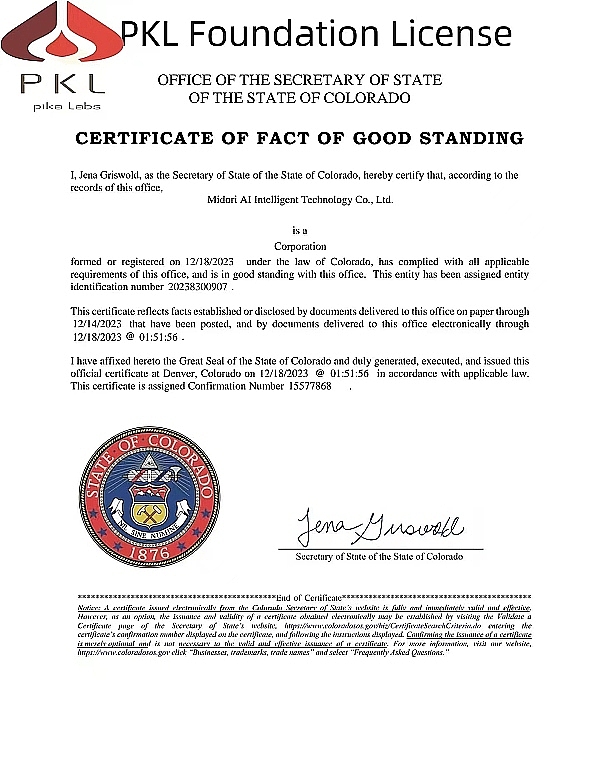 Pika labs(PKL)基金会许可证由科罗拉多州州务卿.耶拿尤斯沃布尔签发证书确认号15577868.