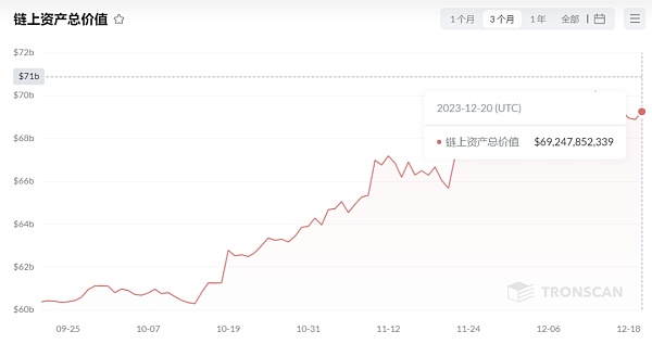 据区块链浏览器TRONSCAN数据,12月20日,波场链上资产总价值为69,247,852,339美元,超692亿美元。