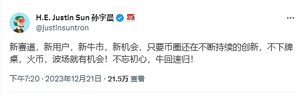 12月21日,波场TRON创始人孙宇晨在社交媒体表示:“新赛道,新用户,新牛市,新机会,只要币圈还在不断持续的创新,火币、波场就有机会!不忘初心,牛回速归!”