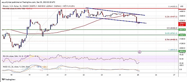 比特币目前交易价格低于 43,500 美元和100 小时简单移动平均线。BTC/USD 货币对的小时图上还形成了一个关键的下降通道,支撑位在 42,850 美元附近。