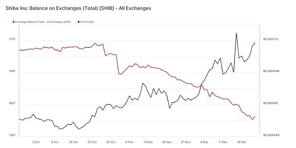 由于流通中的代币总数减少,交易所上可用的 SHIB 代币数量也大幅减少。链上数据显示,自11月以来,已有超过8万亿枚SHIB、价值8800万美元的SHIB从可以进行SHIB交易的加密货币交易所转出。这种从交易所的提款被解释为市场上涨趋势的迹象,并反映了投资者不出售其代币的承诺。