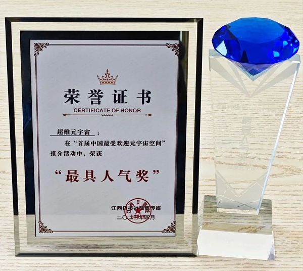 2023年4月20日,由江西日报社主办的“首届中国最受欢迎元宇宙空间”评选榜单出炉,超维元宇宙荣获“最具人气奖”。