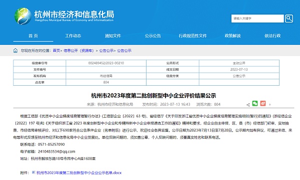 2023年7月13日,公司获评杭州市创新型中小企业。