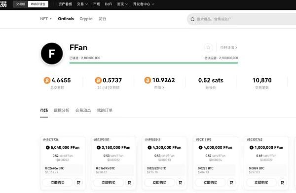 不久前,铭文FFan非凡在OKX Ordinals Brc20市场成功完成了铸造工作,仅耗时五个小时,并吸引了203位生态应用伙伴的积极参与。根据数据显示,截至香港时间 2023年12月25日20:00,FFan市值接近 10.9 BTC,地板价0.52 sats,交易笔数已超过1万笔。