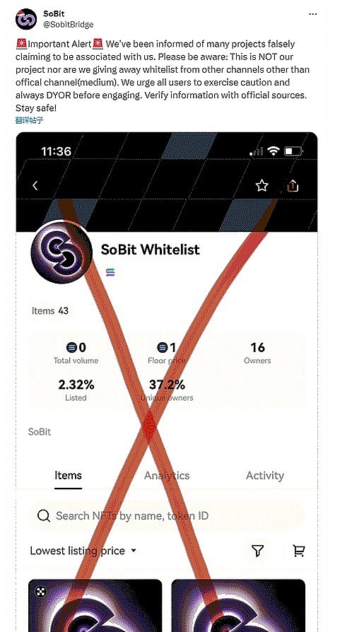 目前,Sobit 十分火爆,市场上也出现了一些 Sobit 的虚假仿盘,并在一些 NFT 平台上构建了虚假的白名单售卖。