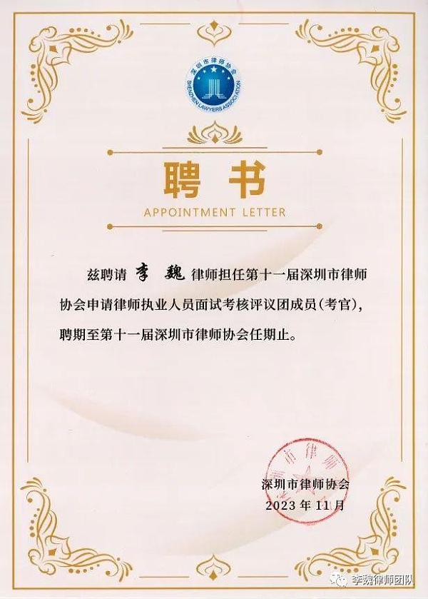 实习律师的面试考核工作,关乎律师行业未来的发展,此次受聘为第十一届深圳市律师协会申请律师执业人员面试考核评议团成员(考官),是对李魏律师的专业能力、执业水平、办案经验、公信力等综合能力的充分肯定。