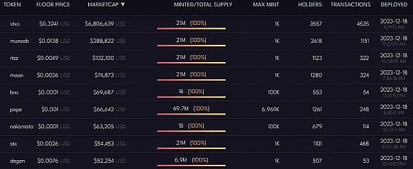 目前,在该链发行的铭文按照当前当前市值排名如下图。从图中可以很明显的看出,该条链上的铭文发展还处于很早期,即便是龙头项目 STXS,市值也不到 700 万美金,超过 10 万市值的铭文项目仅有三个。