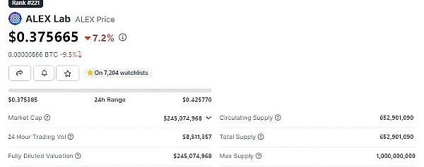 ALEX 是 Alex Labs 的原生代币,也是平台提供流动性和质押的奖励媒介,目前 ALEX 价格为 0.375 美元,市值约为 2.45 亿美元。
