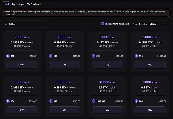 虽然,Stacks 铭文市场整体市值相对较小,但目前已经有可以进行二级交易的场所。经过了一次版本迭代,目前在该平台交易 STX 20 项目的基本体验可以满足,目前仍存在吐槽点有: