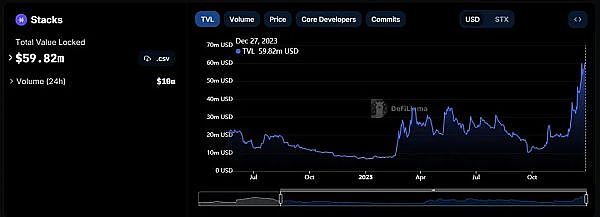 通过分析 Stacks 链上数据,该生态仍处于早期,TVL 近 6000 万美元。若可以 2024 年产品升级的同时赶上 BTC L2 的概念很有可能跑出几个过亿市值,甚至上十亿的项目。