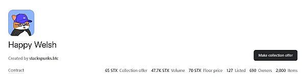 在最近的一周,Stacks 生态讨论热度最高的 NFT 项目是 Happy Welsh,其项目代币也从上半年的归零到这波行情暴涨数十倍。Happy Welsh 总量为 2000 ,地板价为 70 STX。