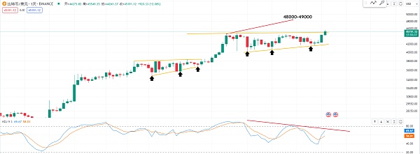 不过我认为明天早上8点的时候我们要去观察这个44.4K 收盘最好是能够站上这个价格 或者是这个位置今天有朋友在问 短期是有点背离 不过我的观点是趋势大于一切 有可能他也是会继续上涨 或者我们也可以观察下一步比特币价格能不能到48000到49000的高位