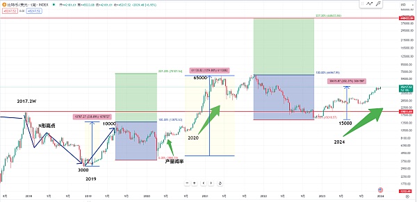 当然这个位置我相信很多朋友都会觉得很夸张 那等下我来和大家聊一下 我是认为2024年比特币肯定会有一个很意外的高点 等下我也看来说一下会有哪些参考的依据