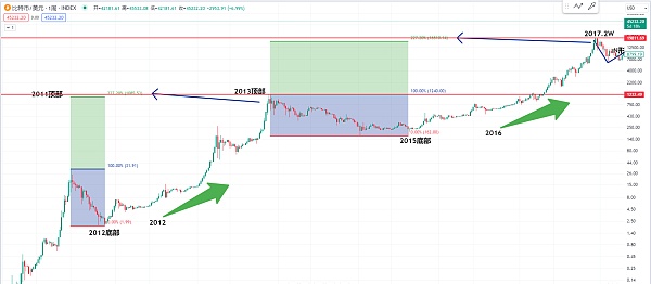 我们先来看一下比特币在历史上2015年的熊市 从2013年的这个高点跌到2015年的底部 也是存在一个对数的规律 就是熊市的高点到这个低点的空间 他后面顶部的位置就是比特币涨到2017年两万的顶部 这个对数黄金比例2.27也是非常接近两万附近