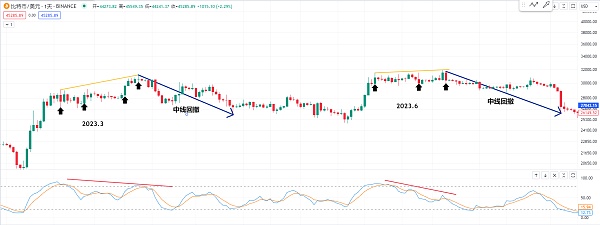 因为我们观察一下过去的历史经验 比如比特币在2023年的6月份 当时涨到这个位置也是一个高点在上移 就是价格在上升 然后他的指标是在背离 后面是有一个中线的回撤