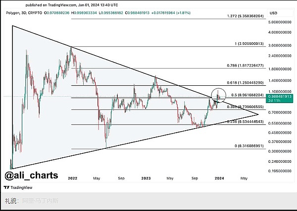 Polygon ($MATIC) 的重大发展,表明即将出现潜在突破。Polygon 目前正处于突破显着的对称三角形模式的边缘。鉴于这一观察结果,建议投资者保持耐心,让这种模式充分发展。