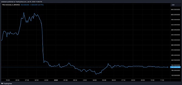自本月初以来,TRB 的价格一直在稳步上涨。根据 Coinmarketcap 的数据,这种成长在 12 月 31 日尤其加剧,将加密货币推至 602 美元的历史新高,交易量增加了 1000%。然而,这种价格上涨未能持续超过几个小时,TRB 暴跌至 139 美元。