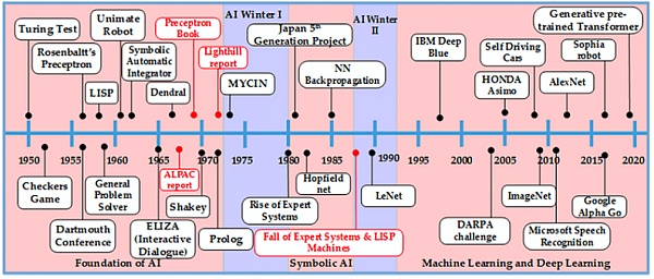 人工智能的历史可以追溯到 20 世纪 30 年代。1950 年代的图灵机,包括图灵测试,正式奠定了人工智能的基础。尽管早期很乐观,但由于计算障碍和无法满足实时需求,人们在 20 世纪 70 年代对人工智能的热情有所下降,迎来了「人工智能冬天」。20 世纪 80 年代,专家系统利用知识数据库模拟人类专业知识,又一次重振了人工智能,并出现了联结主义的复兴和循环神经网络的兴起。
