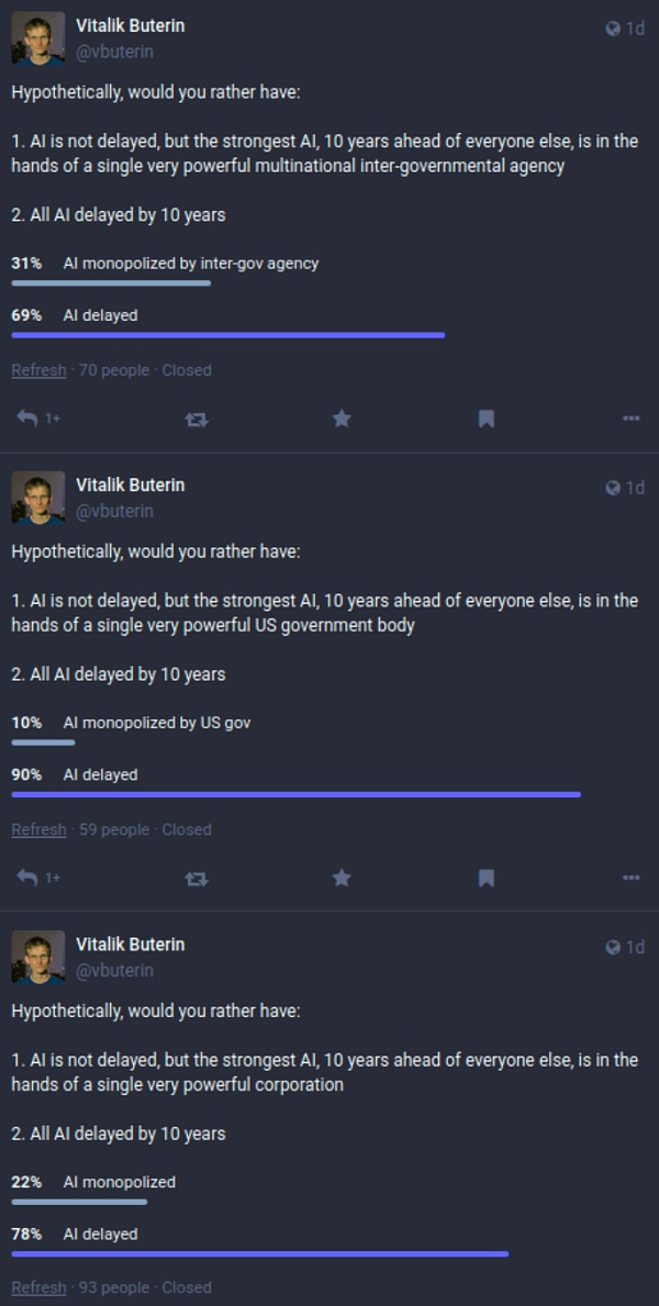 Vitalik 最近进行的一项民意调查显示,人们担心出现 AI 垄断版本,普遍倾向于推迟 AI 进步。